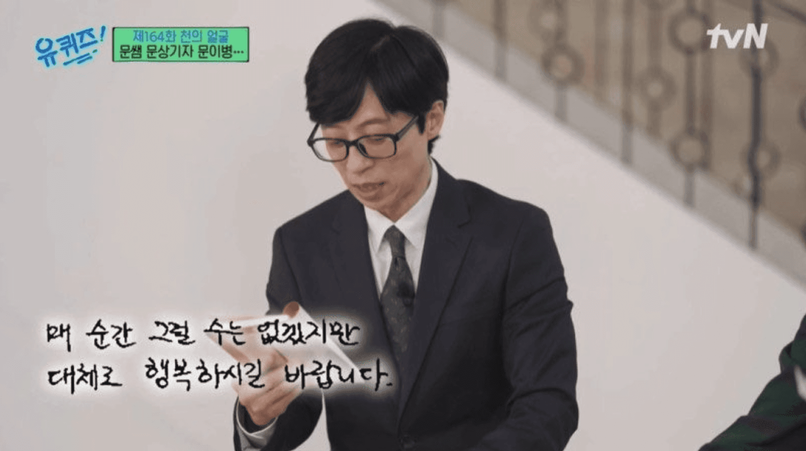 예를 들면 문상훈 님이 유퀴즈에서 유재석 님한테 편지 읽어주는 장면이 있었거든요. 거기서 "대체로 행복하세요"라는 말이 나왔어요. 그 한 줄이 좋아서 저도 일상에서 자주 가져다 쓰거든요. 이제는 제가 원래 쓰던 말 같기도 하고요.