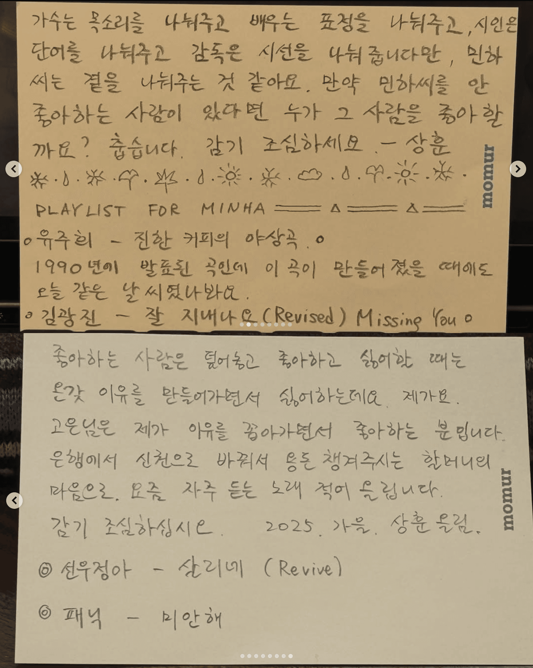 박정민 님은 결이 살짝 달라요. 박정민 님 특유의 솔직하고 날것의 표현이 있는데요. 따라 쓰다 보면 결국 이쪽이 제 입에 붙더라고요.