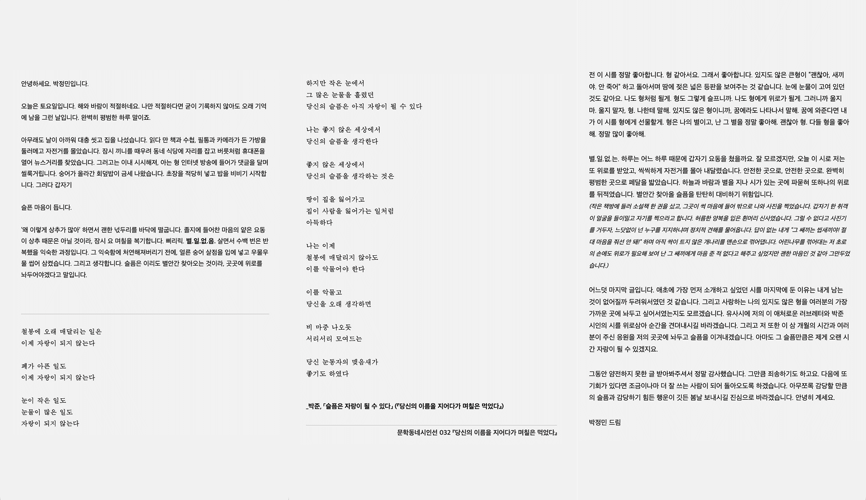 두 사람 다 쓰는 사람이라는 공통점이 있어요. 제가 이렇게 글로 뭔가 표현하게 된 것도 큰 줄기는 그 영향이고요.